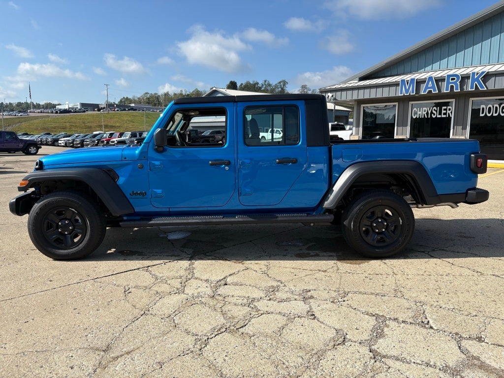 Hydro Blue Pearlcoat 2025 Jeep Gladiator Sport 4WD 8-Speed Automatic 3.6L V6 24V VVT 110 MPH Vehicle Max Speed Calibration, 12.3 Touchscreen Display, 3.73 Rear Axle Ratio, 4-Wheel Disc Brakes, 4G LTE Wi-Fi Hot Spot, 8 Speakers, ABS brakes, Air Conditioning, Alexa Built-In, AM/FM radio: SiriusXM, Apple CarPlay, Apple CarPlay/Android Auto, Auxiliary Switches, Black 3-Piece Hard Top, Brake assist, Class IV Receiver Hitch, Cloth Low-Back Bucket Seats, Compass, Connectivity - US/Canada, Delay-off headlights, Driver door bin, Driver vanity mirror, Dual front impact airbags, Dual front side impact airbags, Electronic Stability Control, Freedom Panel Storage Bag, Front anti-roll bar, Front Bucket Seats, Front Center Armrest w/Storage, Front fog lights, Front License Plate Bracket, Front reading lights, Google Android Auto, Heavy-Duty Engine Cooling, Illuminated entry, Integrated roll-over protection, Low tire pressure warning, MOPAR All-Weather Slush Mats, Mopar Black Tubular Side Steps, MOPAR Spray In Bedliner, Normal Duty Suspension, Occupant sensing airbag, Outside temperature display, Overhead airbag, Panic alarm, ParkView Rear Back-Up Camera, Passenger door bin, Passenger vanity mirror, Power steering, Power windows, Quick Order Package 24B Sport, Radio data system, Radio: Uconnect 5 w/12.3 Display, Rear anti-roll bar, Rear reading lights, Rear Sliding Window, Rear Window Defroster, Remote keyless entry, Speed control, Split folding rear seat, Steering wheel mounted audio controls, Tachometer, Telescoping steering wheel, Tilt steering wheel, Traction control, Trailer Hitch Zoom, Trailer Tow & Aux Switch Group, Trip computer, USB Host Flip, Variably intermittent wipers, Voltmeter, Wheels: 17 x 7.5 Black Steel Styled.